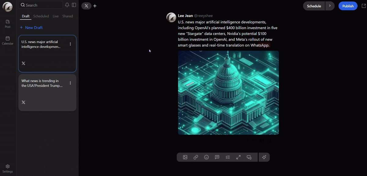 • AI Drafting & Hook Refinement: Sharpen your intros and optimize clarity so your posts grab attention fast.